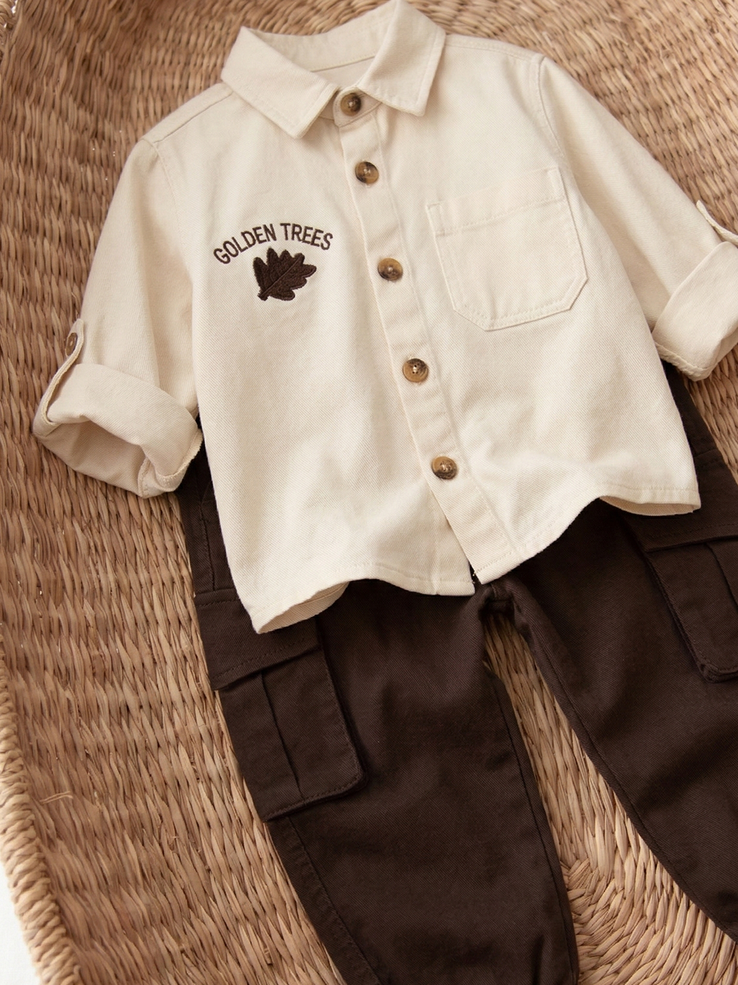 Gabardin Pantolon Gömlek Leaf Takım 3-7 Yaş Krem